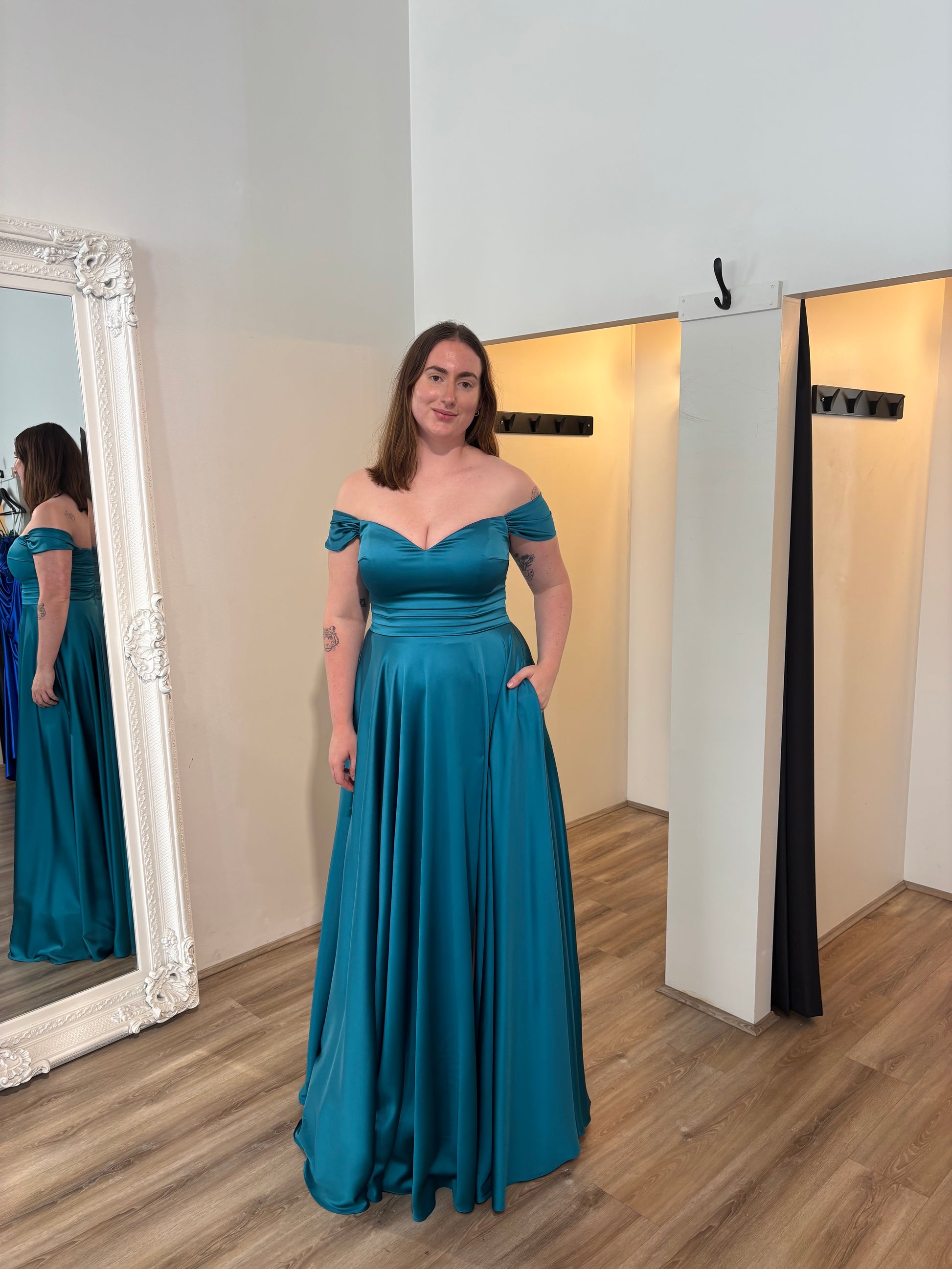 Satin, full length.
